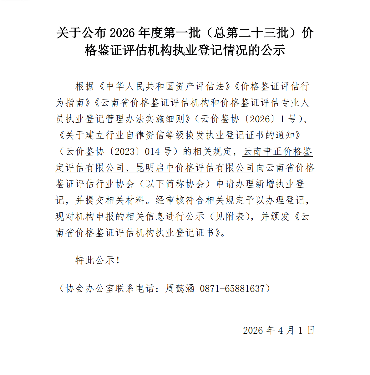 正文:关于公布2026年度第一批(总第二十三批)价格鉴证评估机构执业登记情况的公示
