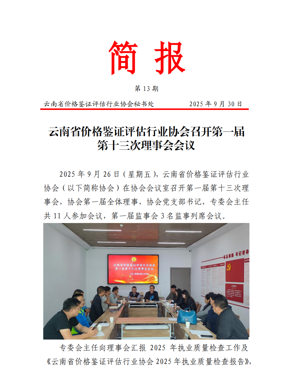 云南省价格鉴证评估行业协会召开第一届第十三次理事会会议简报