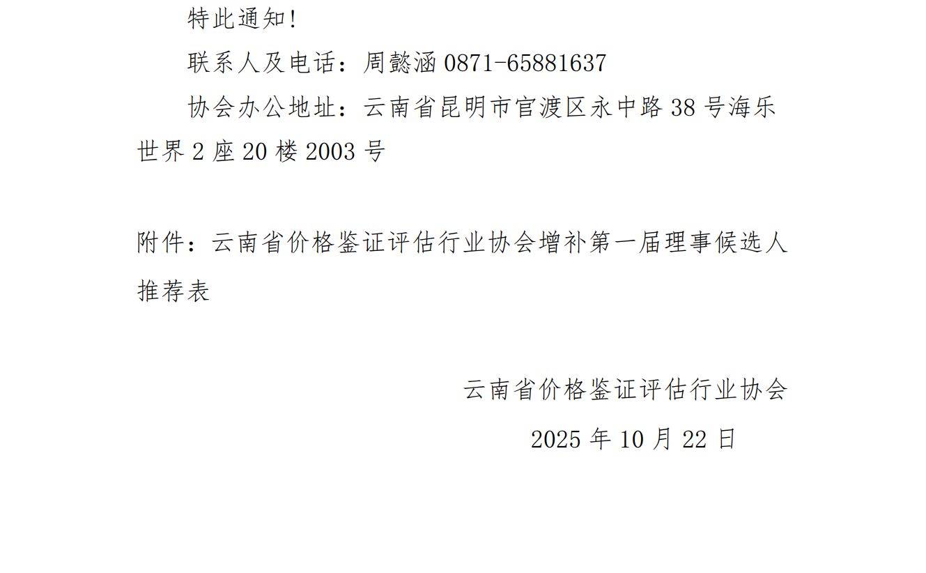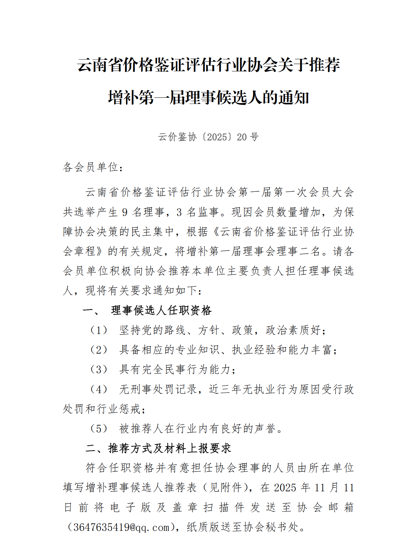 云南省价格鉴证评估行业协会增补第一届理事候选人推荐表