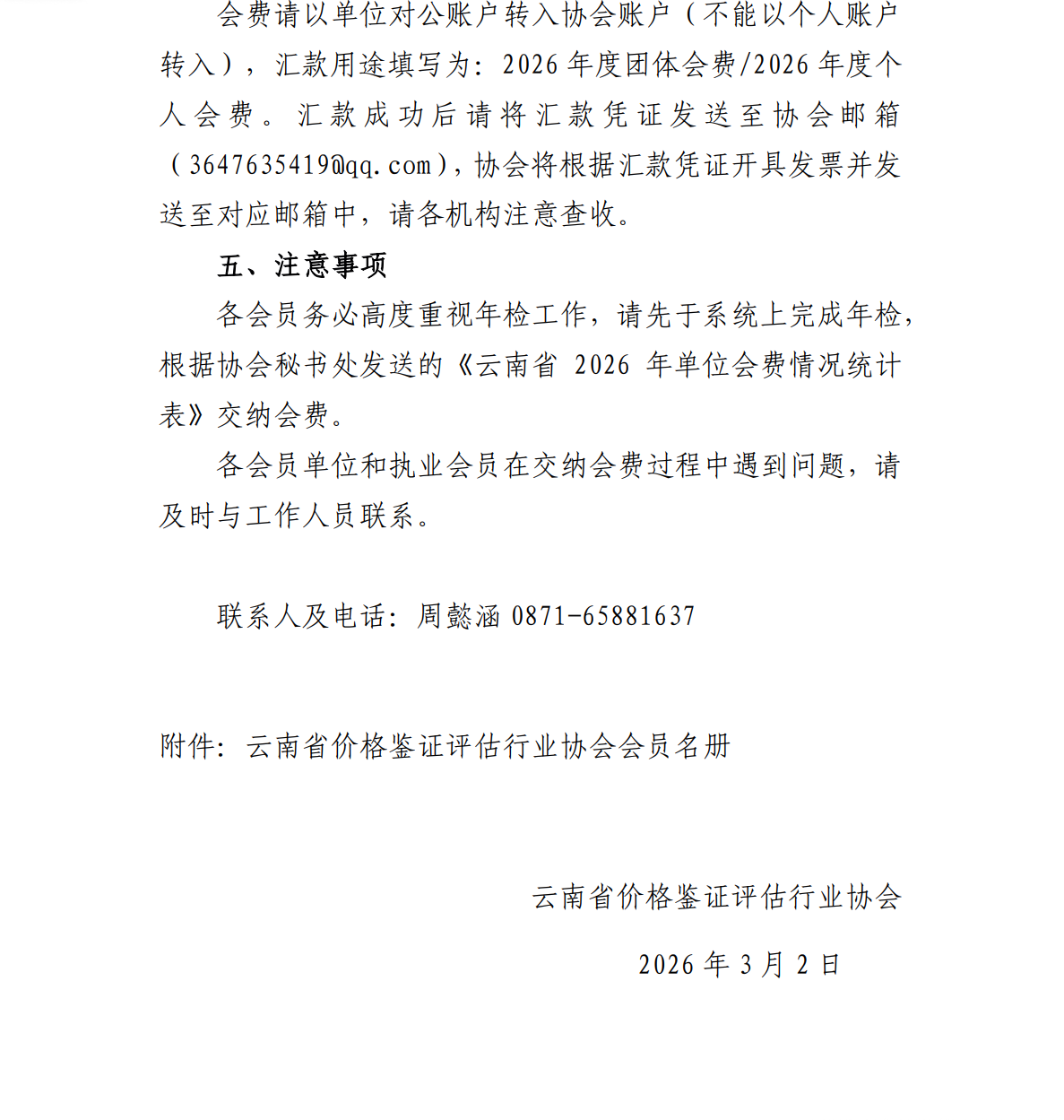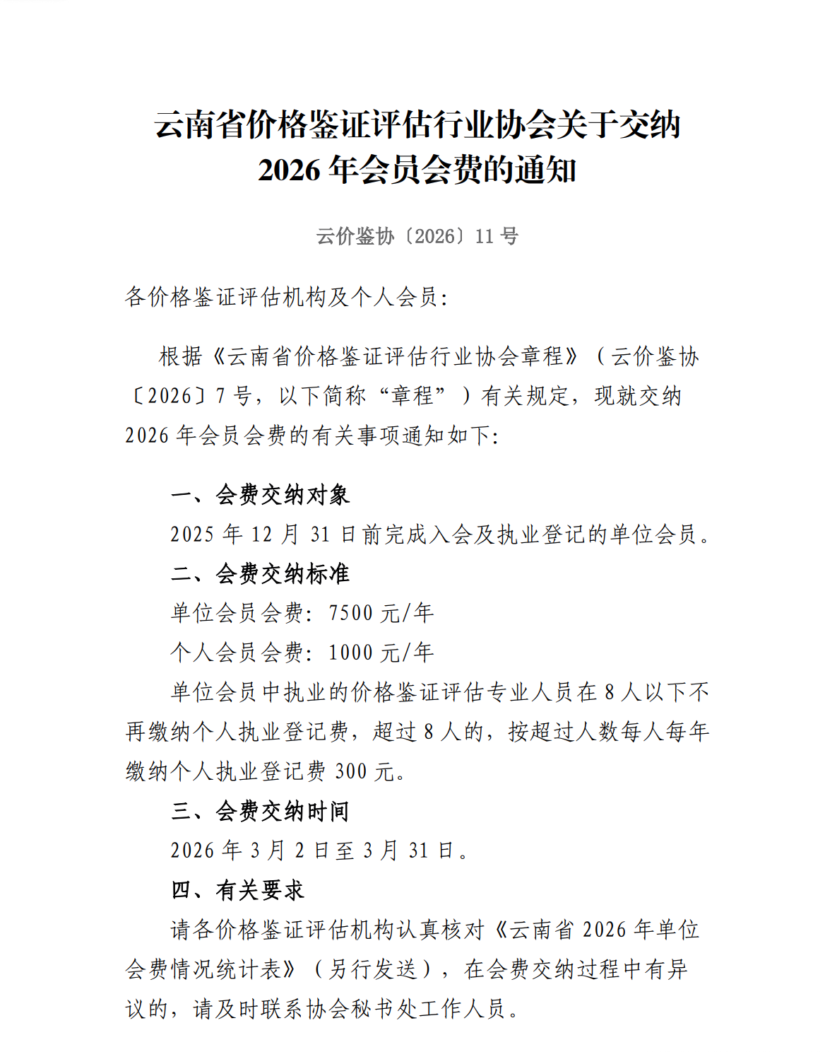 云南省价格鉴证评估行业协会关于交纳2026年会员会费的通知